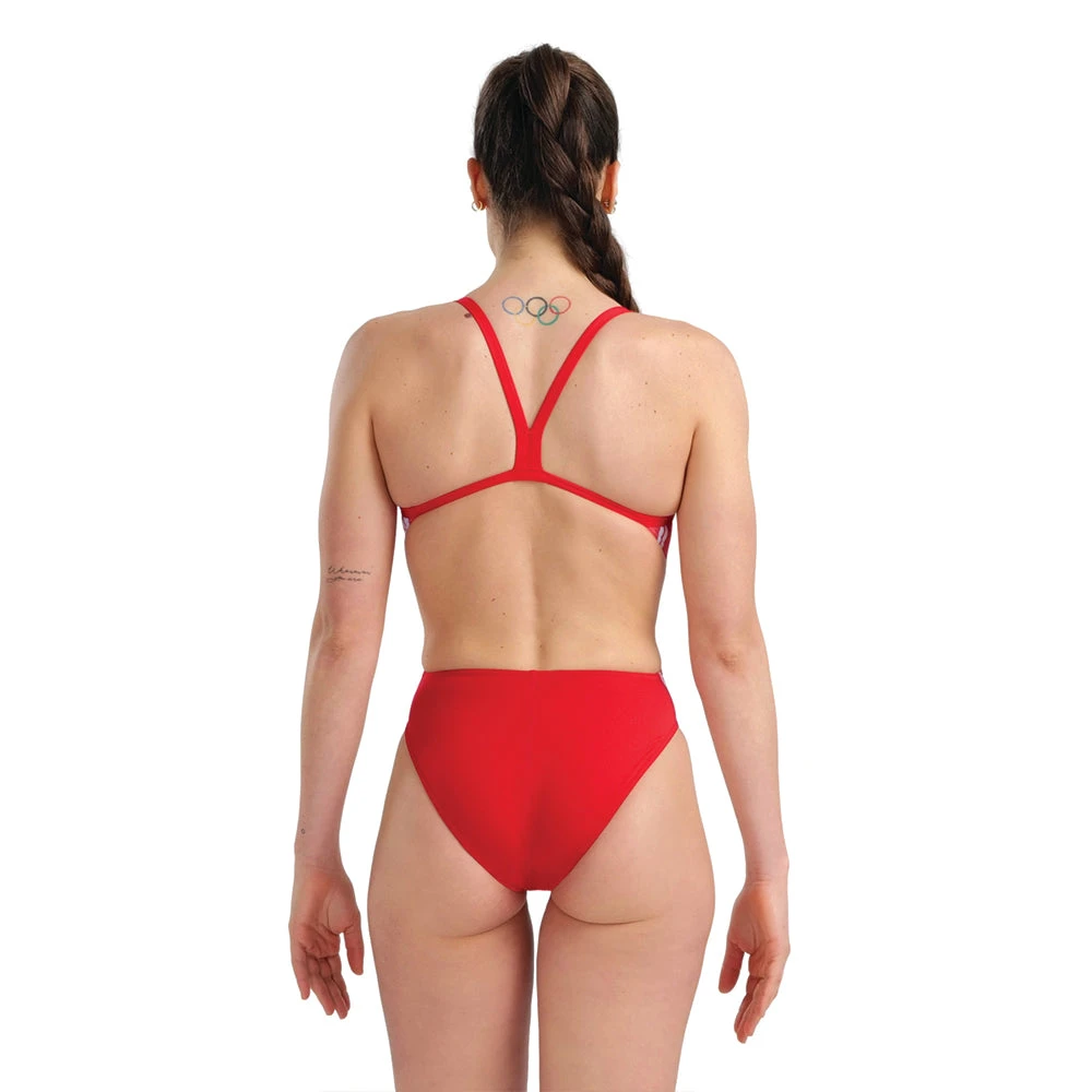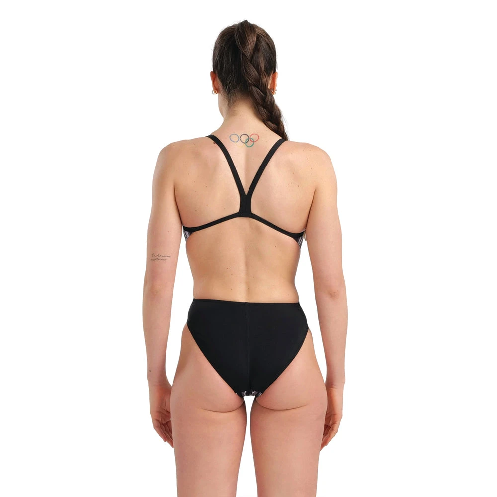 The Arena women’s marbled challenge back is made with MaxlifeEco fabric to deliver maximum resistance to chlorinated water. This new version of a Maxlife suit is made with more than 50% recycled polyester that helps save energy, reduce C02 emissions and inimize water usage while being made. With thin straps and high cut legs this open back style is comfortable and durable practice after practice.