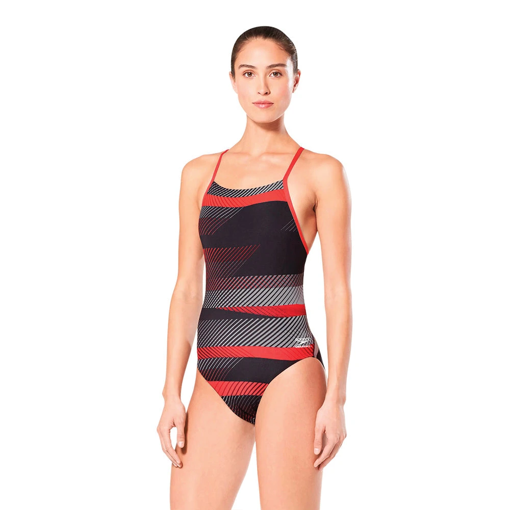 Get ahead of the competition. Endurance+ fabric helps this printed swimsuit maintain its shape and color after every swim, every season. Ultra-thin crisscross straps and a cutout back promote better range of motion and support while offering a stylish finish.