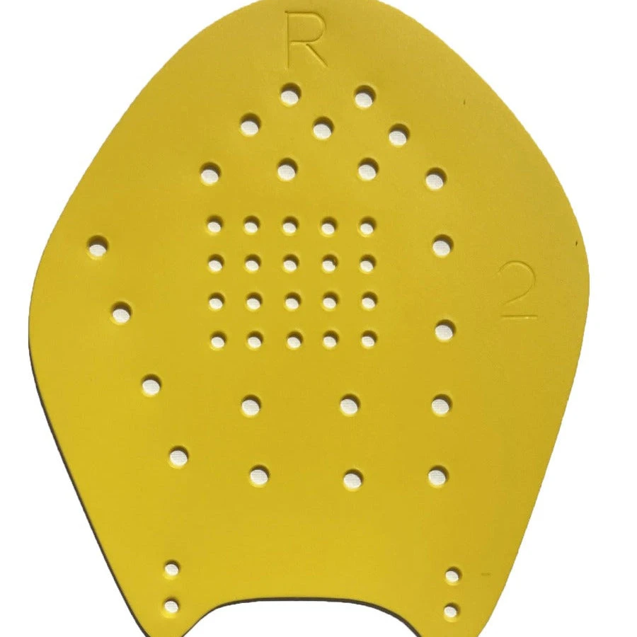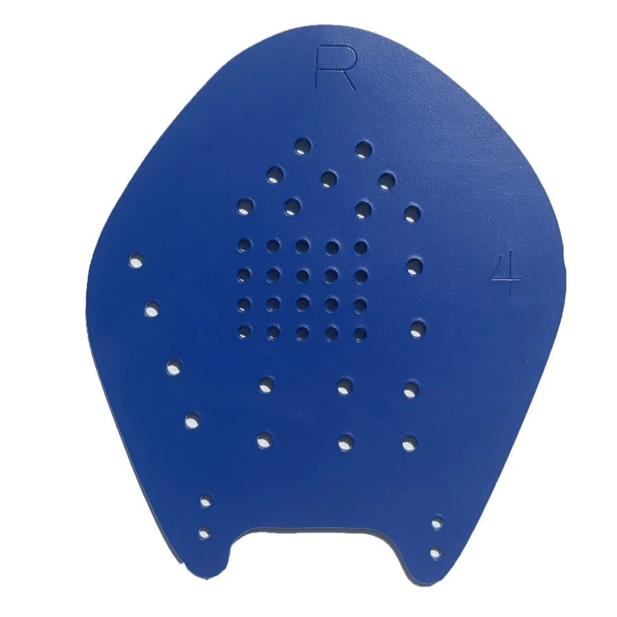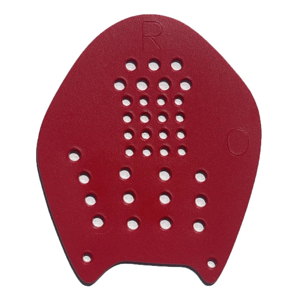 Strokemakers were designed to build strength and provide stroke correction. The hand should fit completely on the paddle with the thumb and first finger near the edge allowing the pinky to have some space on the outside edge. Hand size in relation to the paddle is the primary way to determine correct sizing. The hand being slightly offset allows for fully finishing the stroke and the outer edge water foil builds strength without putting pressure on the joints.
