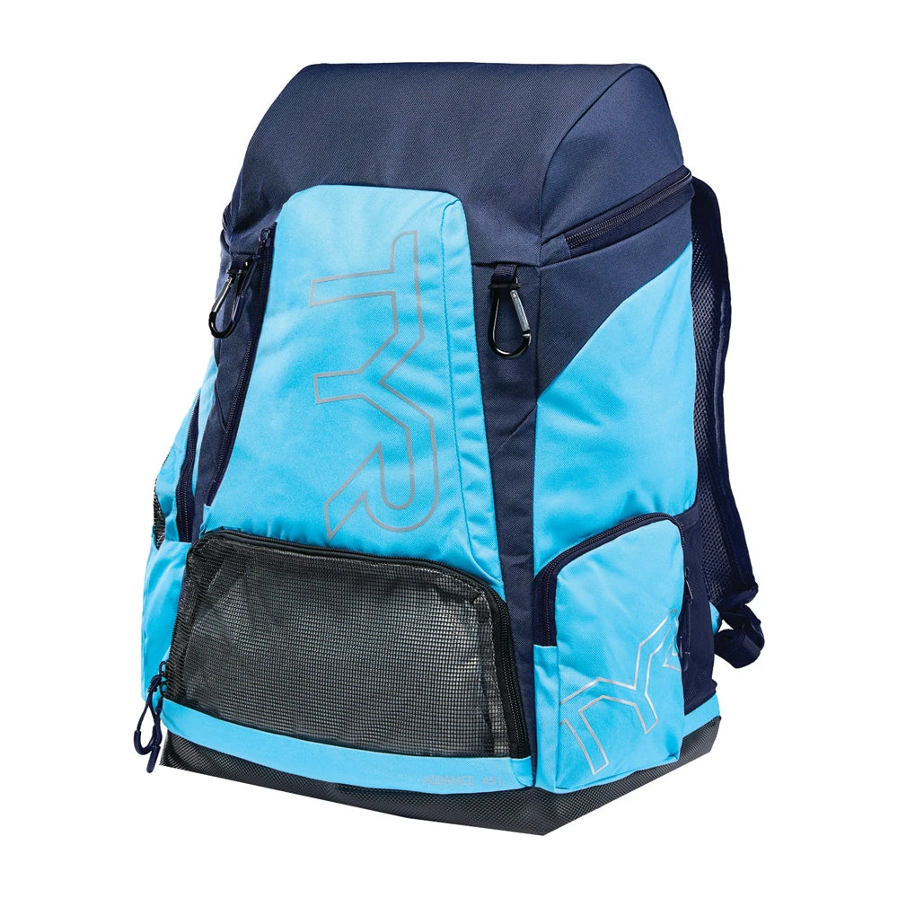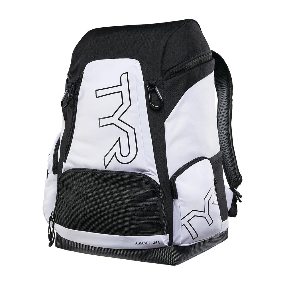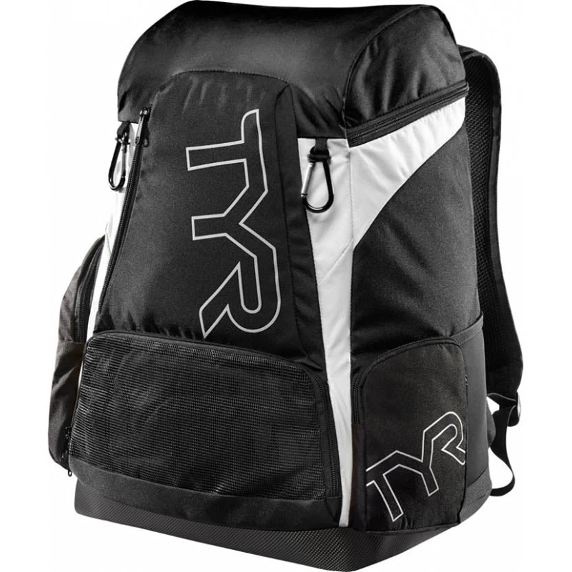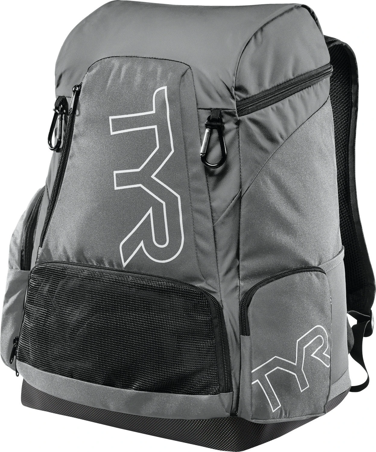 The TYR Alliance 45L Backpack is always prepared for athletes on the move. This updated version of a classic offers innovative features tailored to active lifestyles. Its advanced design optimizes storage space while minimizing bulk. The backpack also boasts contour-shaped padding for superior ergonomics and lumbar support, along with front and side pockets, expandable mesh compartments for organizing wet and dry items, spring hooks for wet suits, a mesh water bottle pocket, adjustable straps, and a protected storage area for larger electronics.
